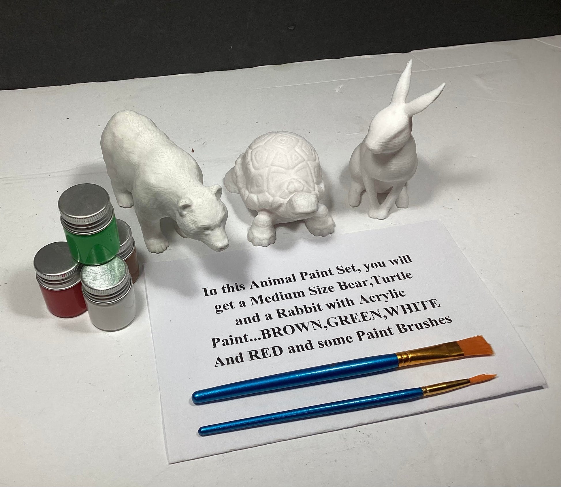 In this set,you will get a 3D Printed BEAR,TURTLE & RABBIT With Brown,White,Green and Red Acrylic Paint and 2 Brushes